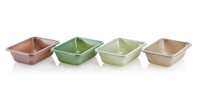 Plasten i de nya förpackningarna kommer från livsmedelstråg och flaskor som samlats in i Europa, tvättas och smälts ner till nya livsmedelsförpackningar. Färgen på trågen får då sin unika färg beroende på vilka färger det insamlade materialet har, det vill säga ingen färg tillsätts. Färgen varierar från olika nyanser av rosa, brunt och grönt.