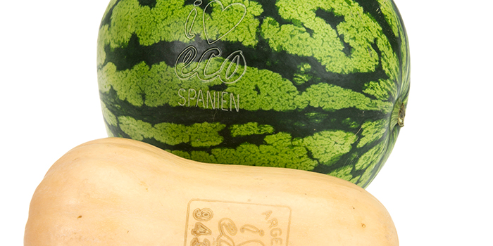Med hjälp av laser kan vi märka frukt och grönsaker. Metoden lämnar inga spår i produkten då det endast är pigmentet i det yttre skalet på frukten eller grönsaken märks. Innovationen sparar märkningsmaterial då varken plastemballage eller klisterettiketter behövs.